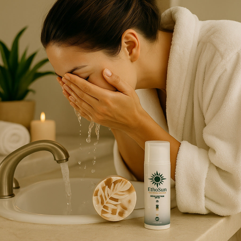 Cleanse with the Golden Aura Zinc Face Bar morning or night, then apply EthoSun SPF 50+ for powerful daily protection and a radiant, smooth finish.
